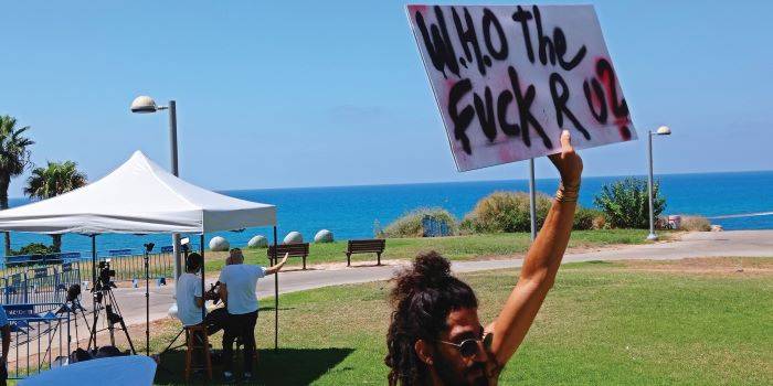 קרן אשכנזי, פעילת מחאה ותיקה מנס ציונה, דיווחה לבראשית: “הגעתי לכביש הגישה להילטון וארבעה שוטרים מיד ניגשו אלי ומנעו ממני לעלות לעבר המלון. הם טענו שאסור להיכנס עם שלטים. ביקשתי להראות לי הנחייה כזו בכתב, הם התעלמו.”