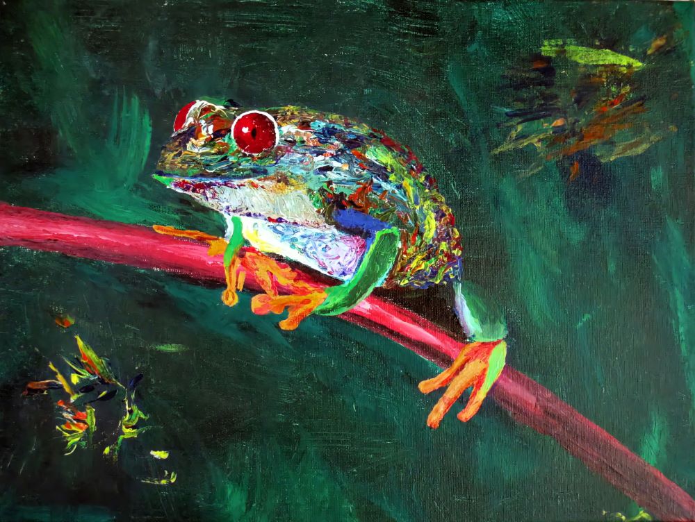 אבל בתקופות שהפצמ”רים והטילים התעופפו מכיוון הרצועה, חומרי הגלם קיבלו טוויסט דרמטי. עכשיו השמיים אדומים לגמרי והטרקטור סופח נגיעות אדומות, מתעטף בצבעים כהים יותר, קודרים. בציור אחר – שמיים שחורים ואקליפטוסים בוערים. ובעוד ציור: אדמה חרוכה לצד עצים שמתאמצים להישאר זקופים ביום שאחרי. האם הצייר שמח על מופע האש הזה, שמשרת את האמנות, או התעצב על המציאות, שמטלטלת את חייו וחיי סביבתו?