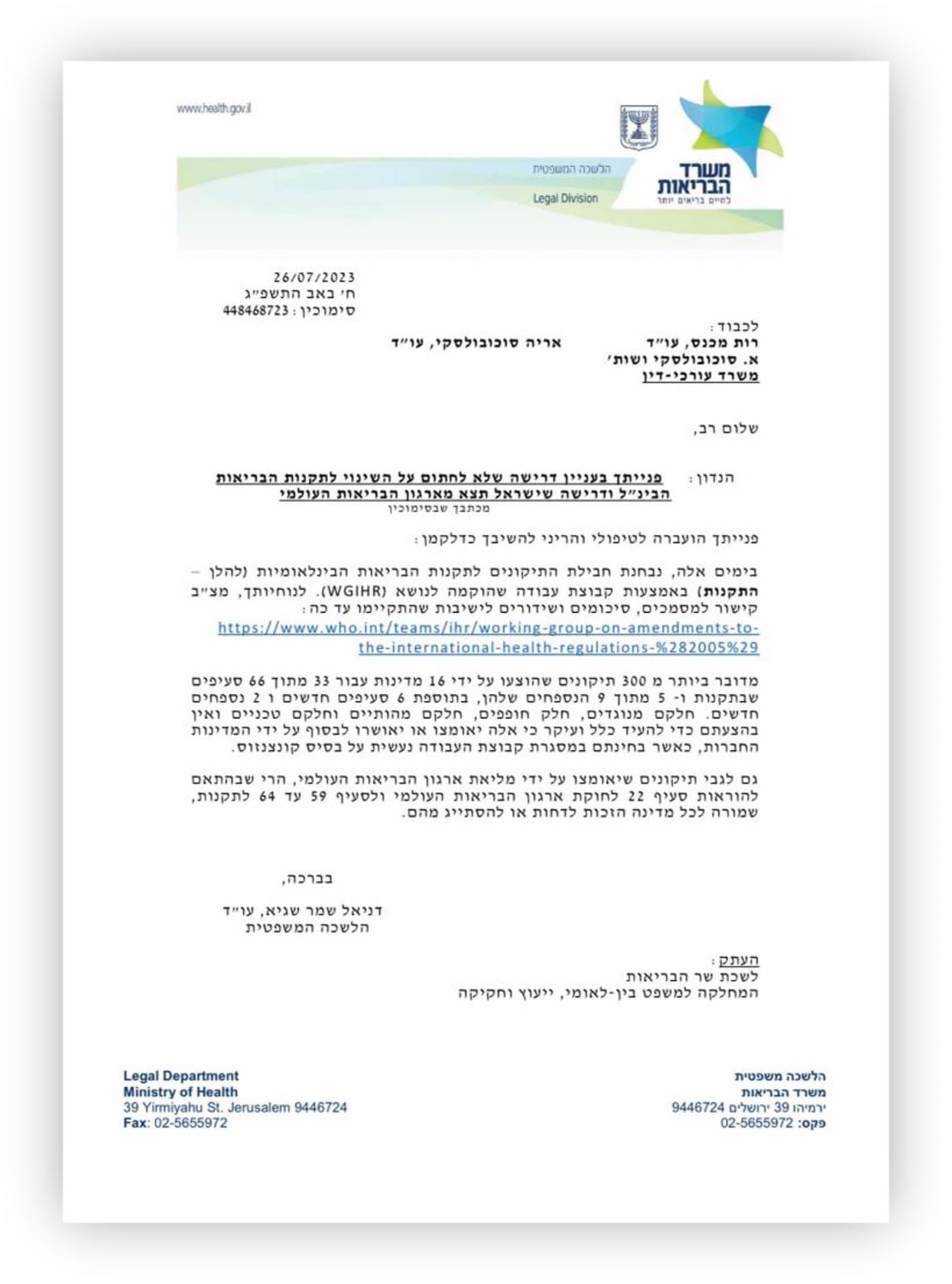 הטענה בפנייתה המפורשת של עורכת הדין רות מכנס סוכובולסקי למשרד הבריאות (ר’ מסמך) כי מדובר בסכנה אמיתית ומוחשית לחירות האנושית ומשום כך יש להיפרד מארגון הבריאות העולמי בדחיפות, וּודאי שלא לעמוד בחוד החנית של התיקונים שהוא מבקש להשית על מדינות המערב, לא נענתה. במקום זאת השיב משרד הבריאות כי הוקם צוות הבוחן את הנושא. מי בצוות? מהן סמכויותיו? האם הצוות מודע לכך שישראל ומרוקו מובילות את המהלכים? האם הצוות כולל משפטנים ועורכי דין העוסקים במשפט בינלאומי? אין לכך מענה במכתב. עם זאת, המכתב כן סוקר את כל מה שכבר ידוע לנו ולא מחדש דבר.