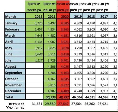 הנתונים מדברים והם מעוררי דאגה ותהיה: על פי הלשכה המרכזית לסטטיסטיקה, בשנת המגיפה 2020 מתו 2,000 בני אדם פחות מאשר בשנת החיסונים 2021. לגבי מספר מקרי המוות בחודשים ינואר עד יולי (כולל יולי) 2022, המצב כבר מבהיל: בשנת 2020 מתו בישראל 27,647 בני אדם. ב–2021 מתו 29,580 בני אדם. וב–2022 מתו 31,631 בני אדם. שימו לב: במהלך שבעת החודשים ינואר–יולי של 2022, מתו בישראל 4,000 בני אדם יותר מהמספר באותם חודשים בשנת 2020.
