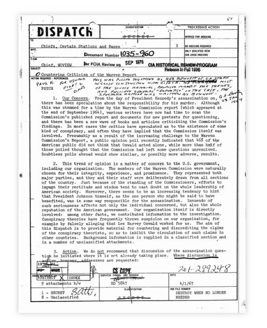 השאלה אם קנדי נרצח על ידי מרצח בודד או במבצע מכוסת”ח היטב של ה-CIA עדיין עומדת בעינה. סקרים עדכניים כיום מראים כי 65 אחוז מהאמריקאים מאמינים שהיתה קנוניה נסתרת סביב מותו. אבל זה לא הנושא שלשמו התכנסנו; מה שיותר מעניין היתה תגובתו של CIA לביקורת, כפי שנחשפה במסמך מסווג שלו, העונה לשם “סיכול ביקורת על דוח וורן” (Countering criticism of the Warren report), ששוחרר לציבור בשנת 1976.