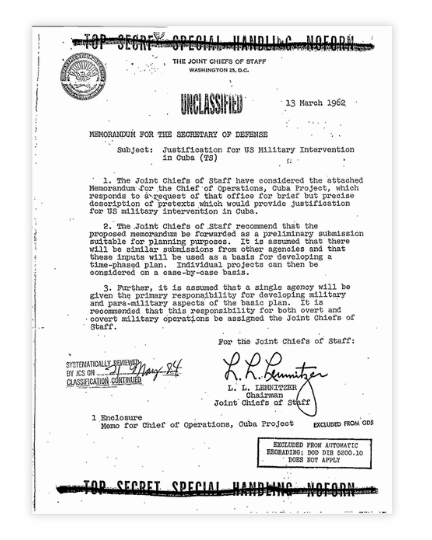 כך לדוגמה היה בשנת 1962, כאשר ראשי המטות המשולבים של צבא ארה”ב הגישו לשולחנו של קנדי הצעה לתוכנית, שנועדה לספק עילה לפלישה צבאית אמריקאית לקובה; התוכנית שכונתה מבצע נורת׳וודס (Operation Northwoods) היתה לערוך מבצע “דגל כוזב”, כלומר לביים תקיפה קובנית על כוחות אמריקאים ובכך להצדיק תגובה צבאית אמריקאית נרחבת.