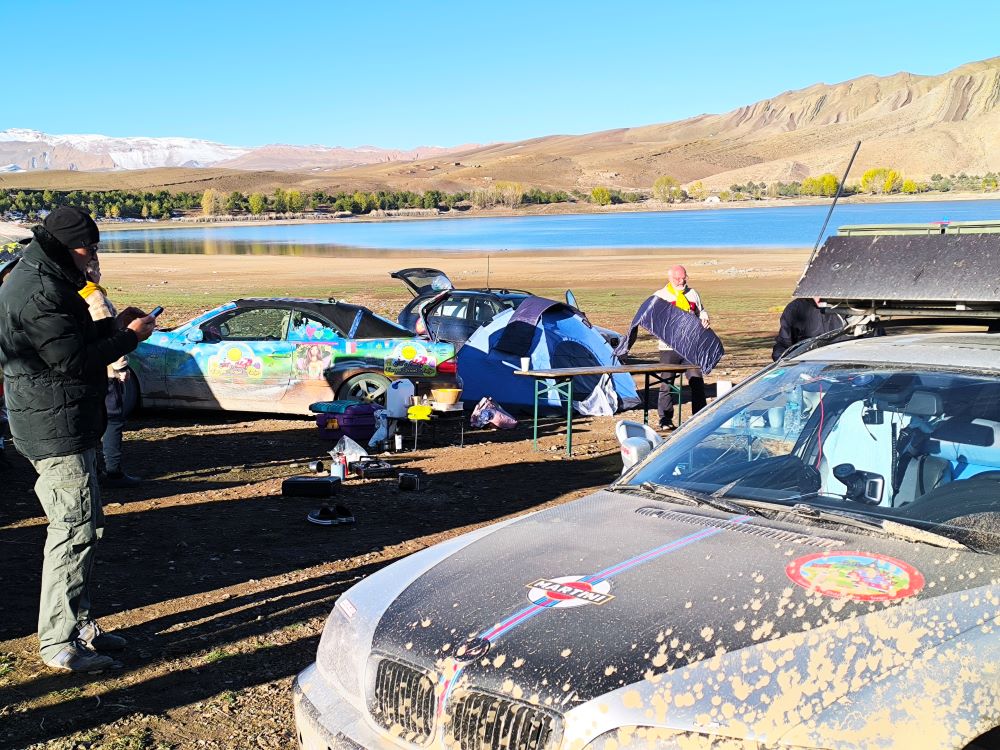 אחרי שכולם נוסעים ווילי ואני נשארים להפשיר בשמש ולאכול ארוחת בוקר על האגם הקסום. לא חולפות כמה דקות ועדר עזים גדול מקיף אותנו מכל עבר ומתחיל ללעוס כל דבר שנראה להן אכיל, כולל הבאנר של הראלי, שקי השינה והאוהל שלנו. ווילי מגן בחירוף נפש על ארוחת הבוקר שלנו, שעומדת בסכנה מוחשית ואני מנסה לסלק אותן משם בקריאות קישטא שמאוד משעשעות את ווילי.