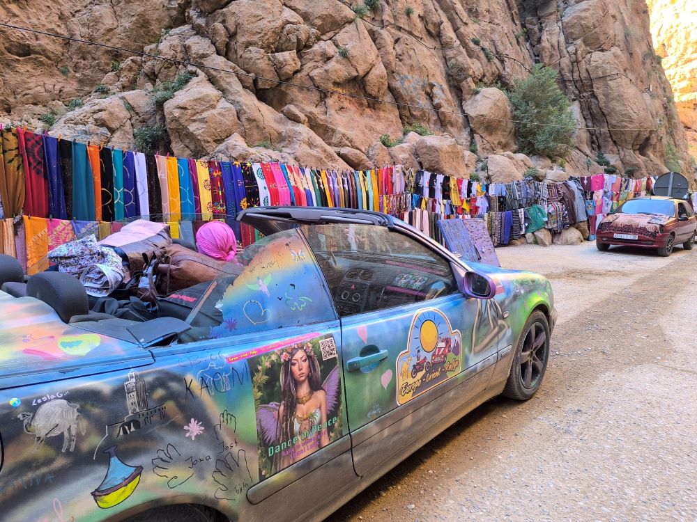 אחרי שש שעות נהיגה אנחנו מגיעים קרוב למכרה בשביל לגלות שהדרך נהרסה כליל מהשיטפונות. אפילו רוג’ר ופסקל, השוויצרים המשוגעים, לא מעיזים לחצות את גשר העץ הרעוע. אחרי עוד שעה של נסיעה מתישה בעיקולים אינסופיים, בעליות ובירידות, אנחנו מגיעים לחניון לילה לא מתוכנן אך חמוד להפליא, שיושב על נהר למרגלות הרי האטלס מתחת מיליון כוכבים.