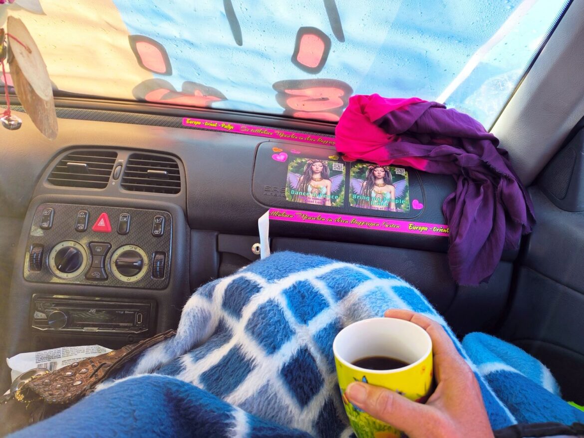 השעה מאוחרת והגשם לא מרפה לרגע. החברים פורשים אט אט למכוניות שלהם (לכולם יש מכוניות גדולות שמאפשרות לינה בדרך זו או אחרת). ווילי ואני מבינים שאין טעם לפתוח את האוהל שלנו, שאפילו לא חסין לטל אז בטח לא למבול שיורד עלינו. אנחנו נכנסים למכונית הצבעונית בעולם, וברור שלרגע הזה היא חיכתה כל המסע. רגע שבו לא תהיה לנו ברירה אלא לתת לה את הכבוד הראוי ולהירדם בחיקה.