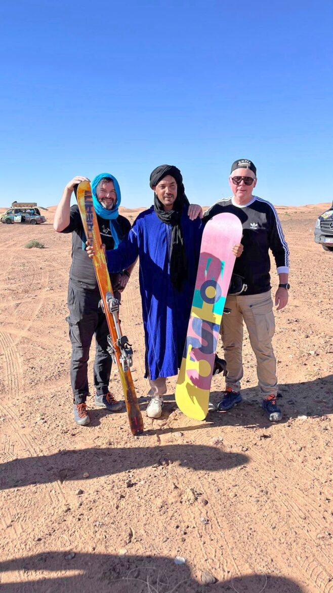 אחרי ארוחת הבוקר ווילי ואני מתלבטים באיזו משימה מטופשת להתחיל, סקי חולות או מרוץ הלמאנש. השוויצרים מקדימים אותנו, הם כבר קשרו את עצמם בחבל ארוך למכונית והתחילו לגלוש בסנובורד על גבי החולות. ווילי, שאמור להיות המבוגר האחראי מתייצב גם הוא עם מגלשי סקי, ואחרי ניסיון כושל הוא אוחז שוב בחבל, מייצב את הגוף, גולש ונעלם באופק יחד עם הג’יפ. הגמלים, שבדיוק היו בהפסקת הבוקר שלהם ורגילים להיות האטרקציה של המדבר, מביטים בנו בהשתאות והמבט המזלזל שלהם מלפנות בוקר מתחלף במבט מעריץ מהול ברגשי נחיתות.