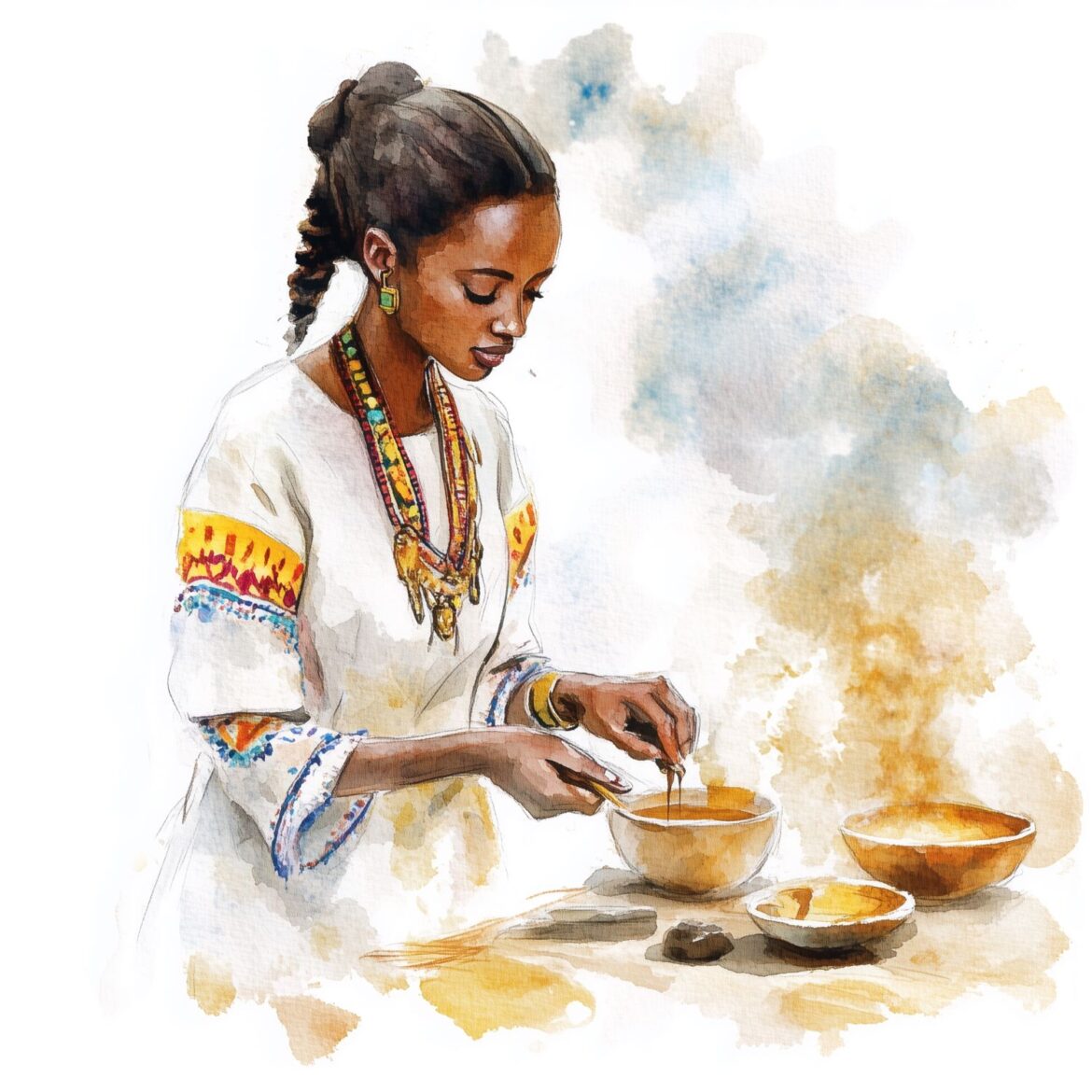 לפני שמתחיל טקס קפה אתיופי, המארחת מטהרת את האוויר מרוחות רעות בקטורת לבונה או קטורת אחרת. לאחר מכן היא מציעה לאורחיה חטיפים מסורתיים כמו פופקורן, בוטנים או שעורה מבושלת. הקפה החזק מוגש שחור והאורחים בדרך כלל ממתיקים אותו עם כמה כפיות סוכר. אולם יש דבר אחד שאסור להם לעשות: לסרב לשתות אותו.