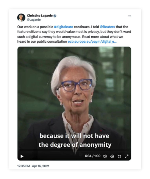בדיון במועצת האיחוד האירופי ב 2023, לגארד מדגישה נקודה חשובה: היורו הדיגיטלי לא יהיה אנונימי. פרטיות תהיה קיימת בו, אך לא אנונימיות. בואו נסתכל על זה מזווית שונה: עבור הבנקים, המפתח למעקב ושליטה הינו הזדהות. הבנק חייב לדעת מי האזרח ולוודא את זהותו, על מנת להפעיל עליו את אכיפת החוק או העדפות הממשל, דרך הגבלות טכנולוגיות. הטענה של לגארד שהטכנולוגיה תאפשר פרטיות אך לא אנונימיות היא מופרכת: כנראה שהבנק המרכזי רואה בעצמו ובספקי השירותים הפיננסיים סוג של אלוהים, שכן מולם האזרח יהיה מזוהה, ועל כן לא ברור איזה סוג של פרטיות יכול להתקיים, ללא אנונימיות.